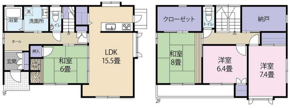間取りは4SLDK、2階の北側にWICと納戸が備わって収納もたっぷりとられており、とても暮らしやすい広さになっています。